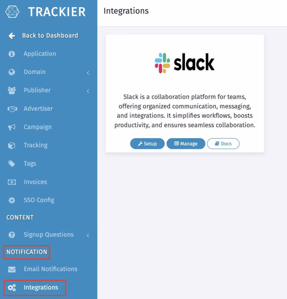 With Slack integration, Trackier ensures no critical update goes unnoticed, whether it’s a campaign cap being reached, a payout change, or a publisher requesting access. This is especially valuable for distributed teams operating across regions and time zones.